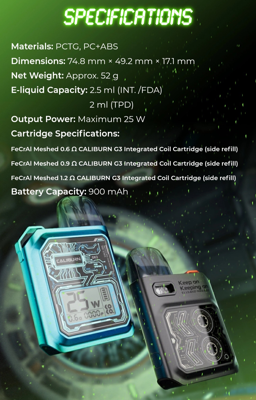 - 1x 0.9 歐姆 Caliburn G3 空煙彈